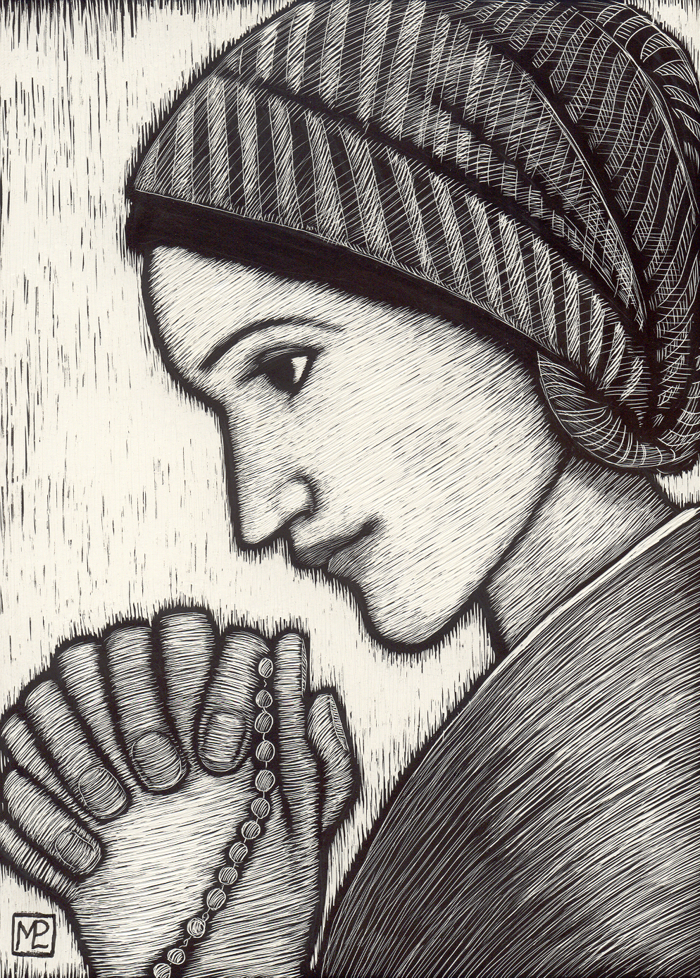 is a freelance artist who works in scratchboard. This medium uses a board coated with clay and then with black ink. With a stylus, the artist removes the top layer of ink, revealing the white underneath.
